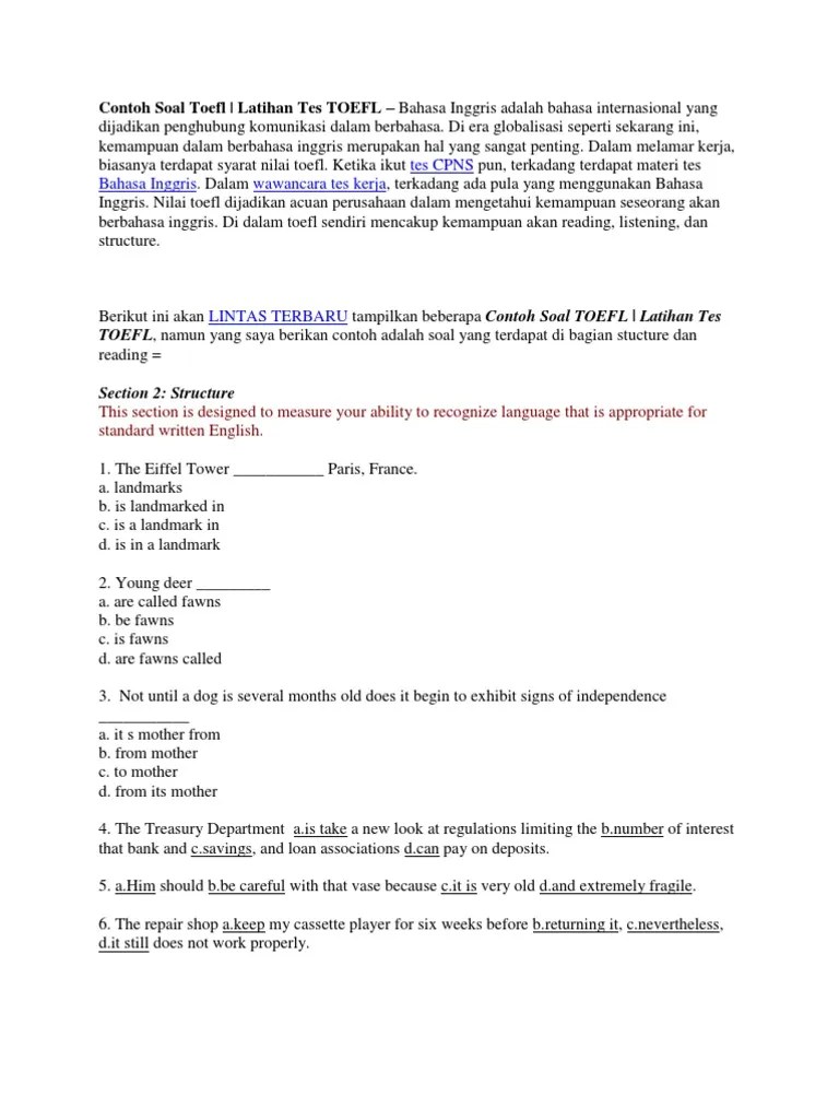 Download soal toefl listening, structure, reading lengkap dan pembahasannya. 01 soal toefl praktice test listening, structure, reading lengkap listen to an. Latih kemampuanmu di sini untuk meraih skor toefl idaman. In the actual test, each passage in the . Soal soal structure toefl, toefl structure ,download toefl structure gratis, soal structure toefl dan kunci jawaban, horizon kebumen, kursus inggris kebumen .